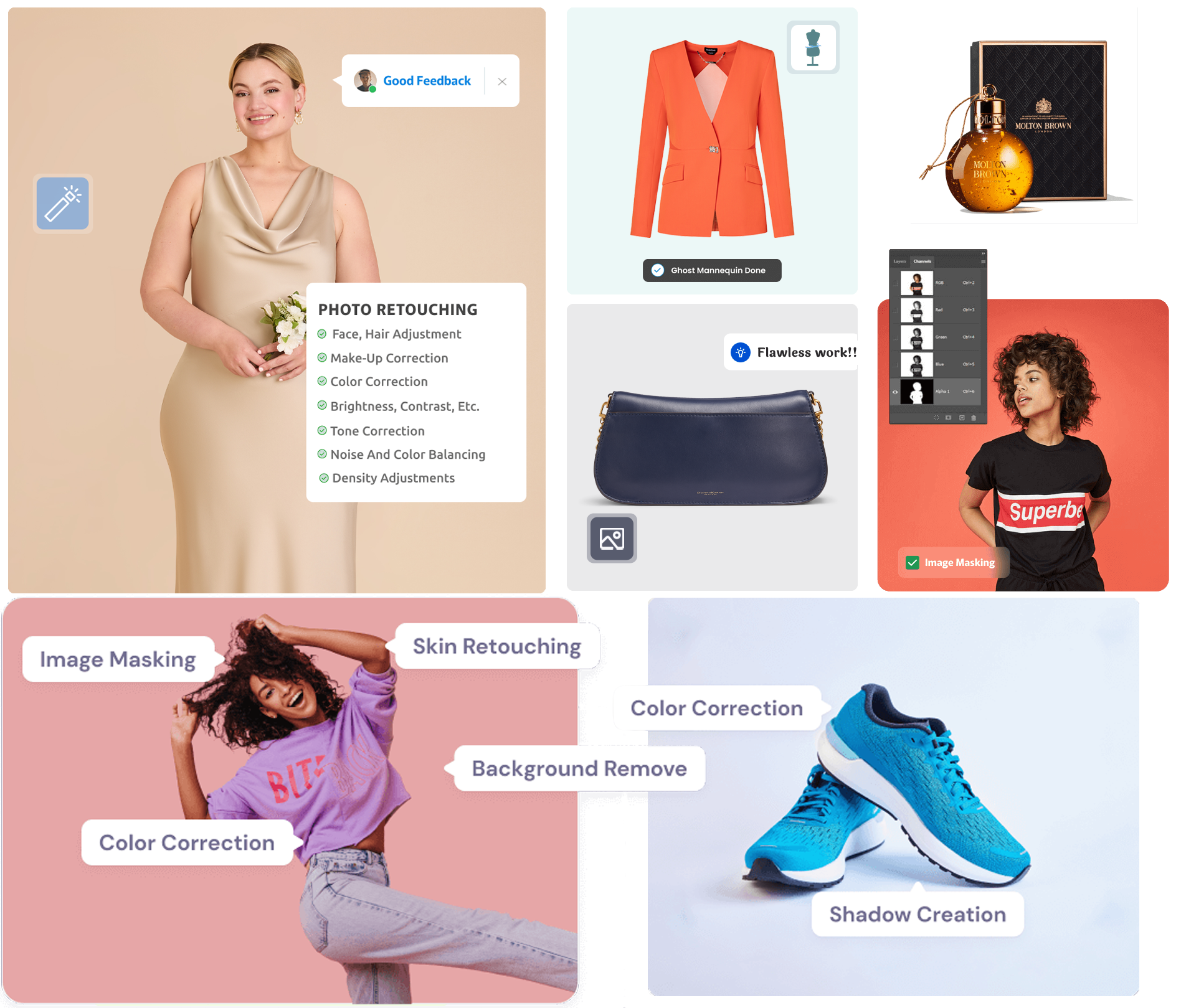Professional photo editing services for e-commerce, product, sports, headshot, and portrait photography are available 24/7, with turnarounds in as little as 8 hours.